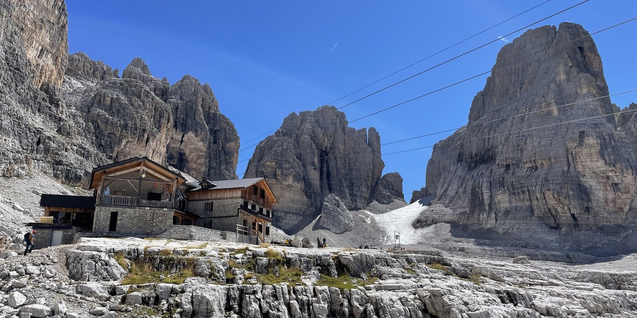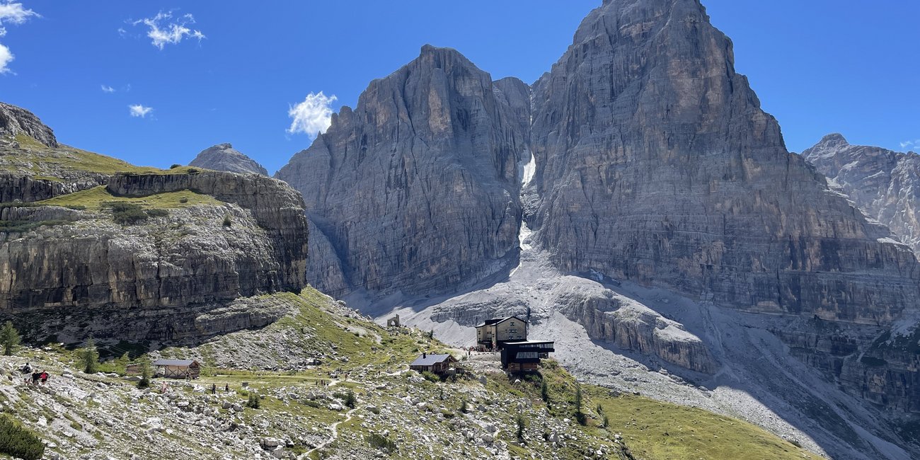 The trail begins with a gentle descent across rocky slopes and gravel terrain, then gradually ascends toward Rifugio Brentei, nestled in a dramatic natural amphitheater beneath towering peaks. From the hut, the path continues to climb steadily toward Bocca di Brenta, with some sections equipped with metal cables to aid the ascent. Finally, you reach the saddle, which reveals unique landscape made of numerous towering vertical mountains divided by deep cliffs, before descending on the other side to the next hut. Along the day, the itinerary offers view on the most iconic peaks of Brenta: Crozzon di Brenta, Cima Tosa and Campanil Basso. Dinner and overnight stay in hut.