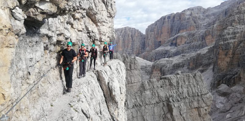Se desideri invece spingerti oltre l’escursionismo classico e scoprire il mondo della montagna più tecnica, un tour guidato privato è la soluzione ideale. Puoi cimentarti su itinerari attrezzati e vie ferrate, imparando le corrette tecniche di progressione in totale sicurezza. Tra i percorsi più iconici spiccano i tour delle Bocchette, un’esperienza spettacolare che permette di attraversare cenge, passaggi esposti e tratti panoramici tra i più suggestivi delle Dolomiti.